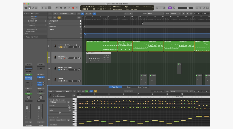 My next steps were to substitute the piano with a high-quality marimba sound (which I purchased from 8dio) to get a better idea of how everything would sound and explore the idea for what might be interesting for the audience to hear and see. I thought the idea of Marco jamming away at the rhythm while reaching across himself to play melody notes would be very interesting and that became the basis for the next section.
