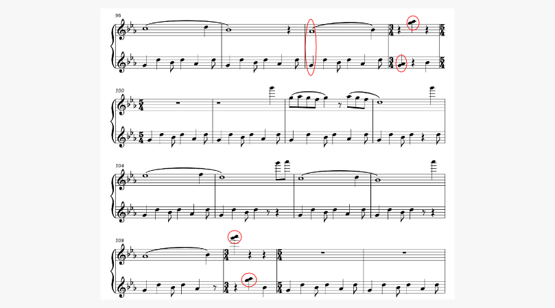 One of the fun things about writing an ostinato is that your brain will “accept” that the ostinato part belongs with the rest of the music, even if it sounds dissonant or “out of tune” with the other parts. I noticed that there was a little “clash” that occurred naturally between the ostinato and the melody towards the end of the idea - two notes that are right next to each other play at the same time, creating a somewhat harsh sound - and I thought it was interesting that it had happened and just as interesting that I’d barely noticed it. I decided to draw attention to the “clash” by repeating it a few times.